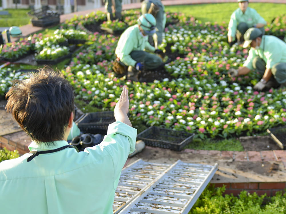 現在、グリーン事業部リゾートメンテナンス課では「世界有数のテーマパーク」、大型ショッピングモール「イクスピアリ」やリゾートホテル等の植栽保護維持管理・メンテナンスを主な事業として展開しています。具体的には、高木の剪定、低木の刈り込み、花の植え替え、芝生刈り込み、それから観葉植物のメンテナンスが中心です。また春夏秋冬で各イベントがありますので、数万数十万のお客様に喜んでいただくイベントの一環を担っています。